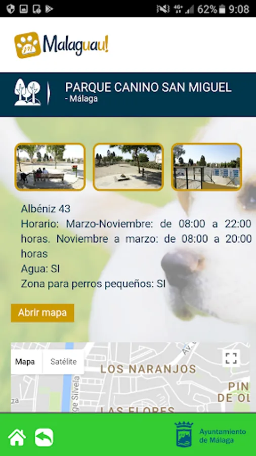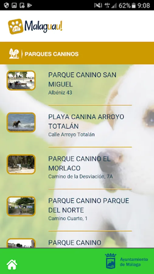 -The present different canine parks in Malaga, including geolocation and detailing them if they have separate sprue and for large and small dogs areas.