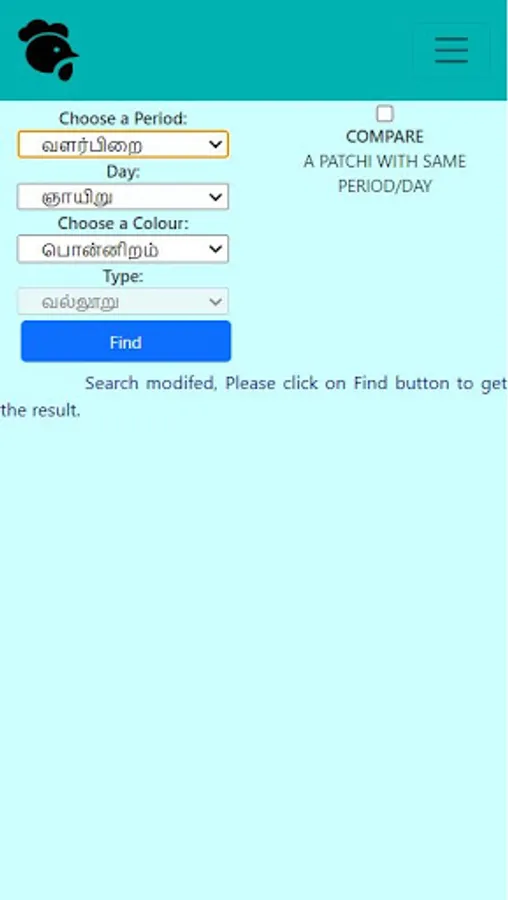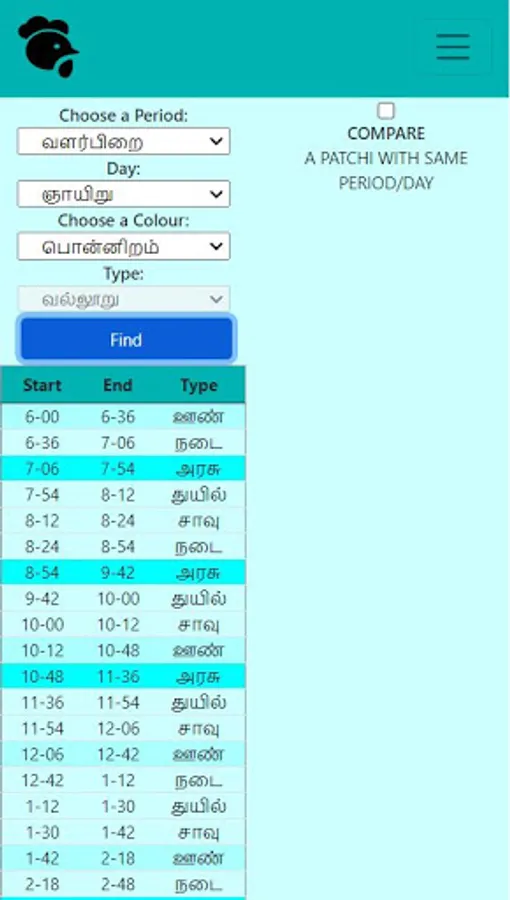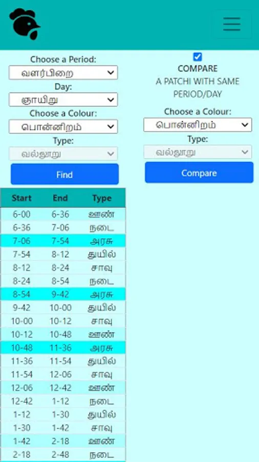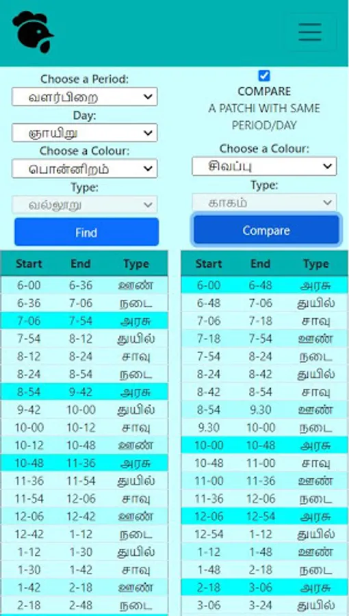 This app will Calculate/Compare the tables based on the content in the book called "kagabusundar panja patchi sasthiram" and Pancha Pakshi Shastra is an ancient Tamil scripture. (written in Tamil palm leaf). Pancha means number 5 and Pakshi or Pakchi or Patchi means bird.