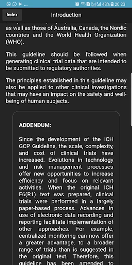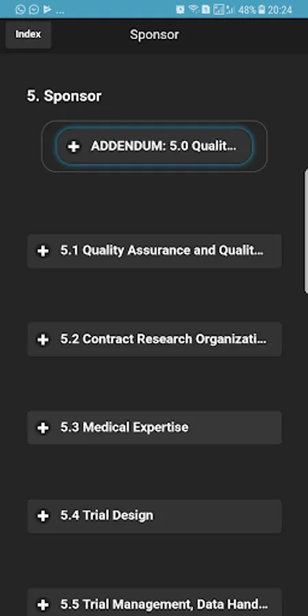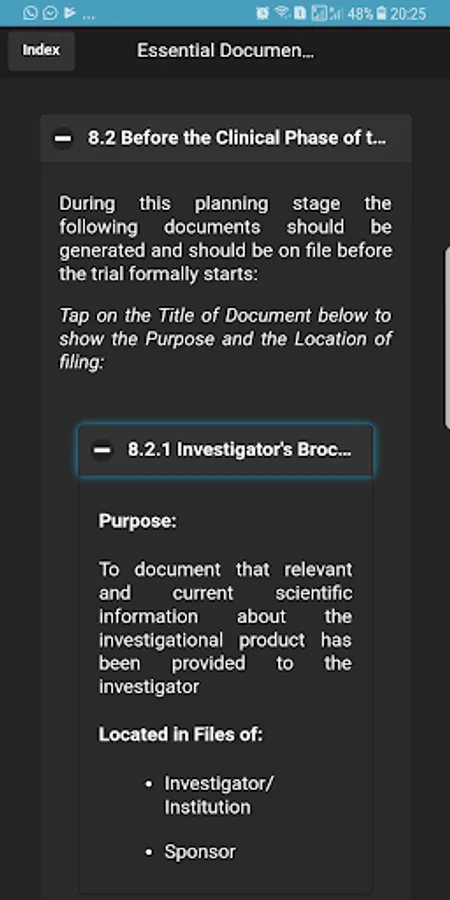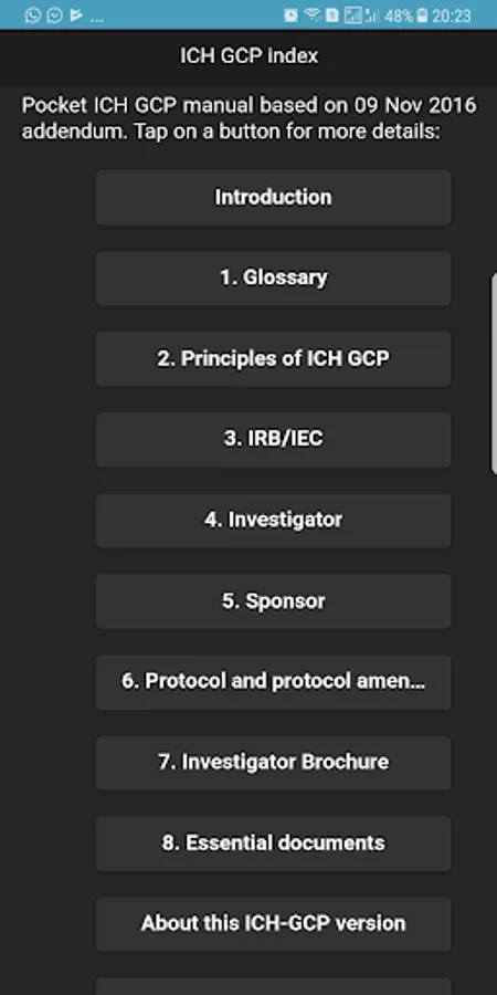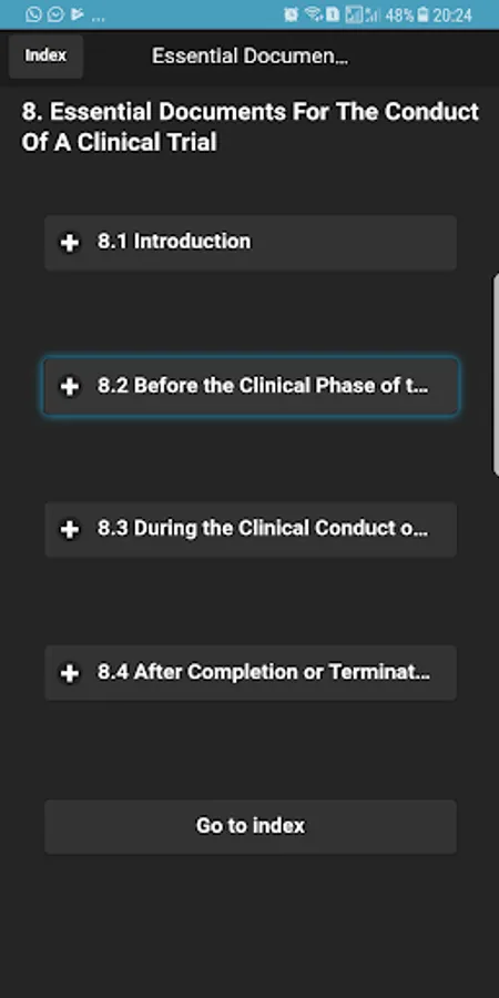 2. ICH-GCP sections are listed as buttons in the Index home screen, making it very easy for the user to jump to the desired section.