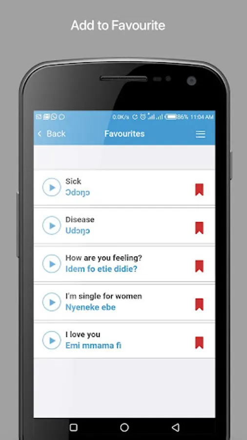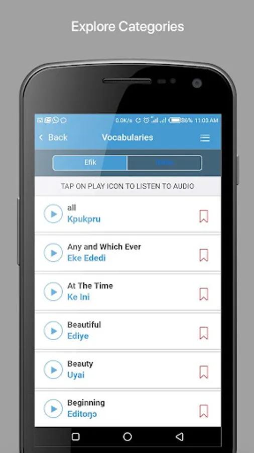 Speak Efik/Ibibio app is designed with various categories to learn from, each category has a list of several words and sentences to learn from.