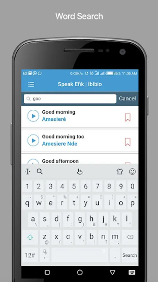 Users can search for any Efik/Ibibio word or sentence that is available in the app by typing the English translation and then tab on the search button to begin a search.