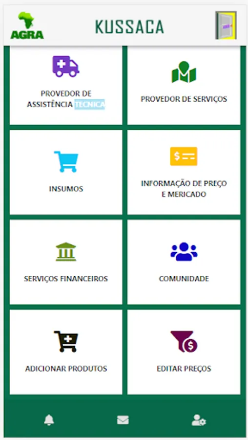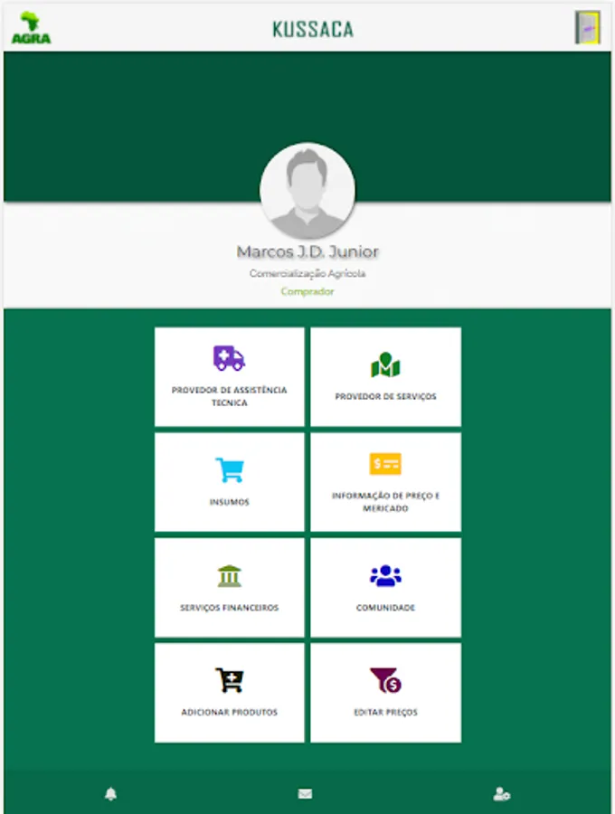 The Kussaca app aims to centralize information for family and commercial farmers, buyers of agricultural surpluses as well as service providers at the district level with a view to doing business. It informs prices of purchase and sale of surpluses, prices of inputs and agricultural implements. The application also offers the farmer access to several essential services such as farming, threshing, veterinarians, agronomists, financial services and much more.