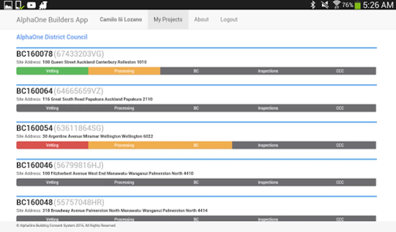 This app is only working for councils that have adopted the AlphaOne online building consenting system - the first New Zealand end to end building consenting solution. The councils that have adopted AlphaOne are Selwyn, Kaipara, Wairoa, Grey, Buller and Westland. There are more in the pipeline and we'll update this description in the near future.