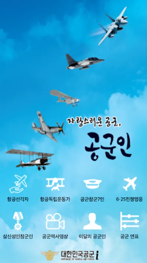 A variety of content such Proud Air Force and the Air Force an app is wiguk commitment and with the Air Force related person information showed the spirit of salsinseongin Air Force infancy, window colors, Korean War from major footsteps and Air Force history UCC of the Republic of Korea Air Force until now a mobile app that provides.
