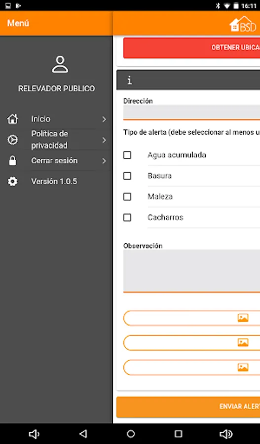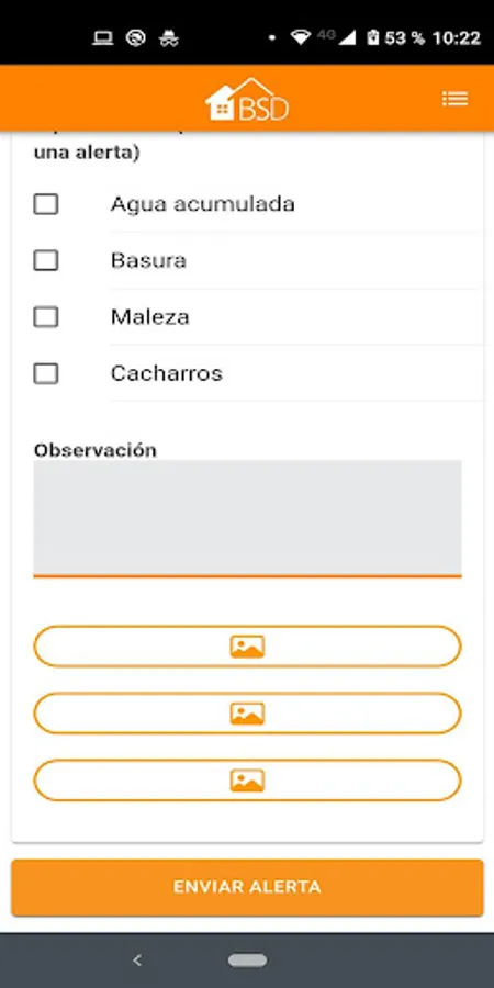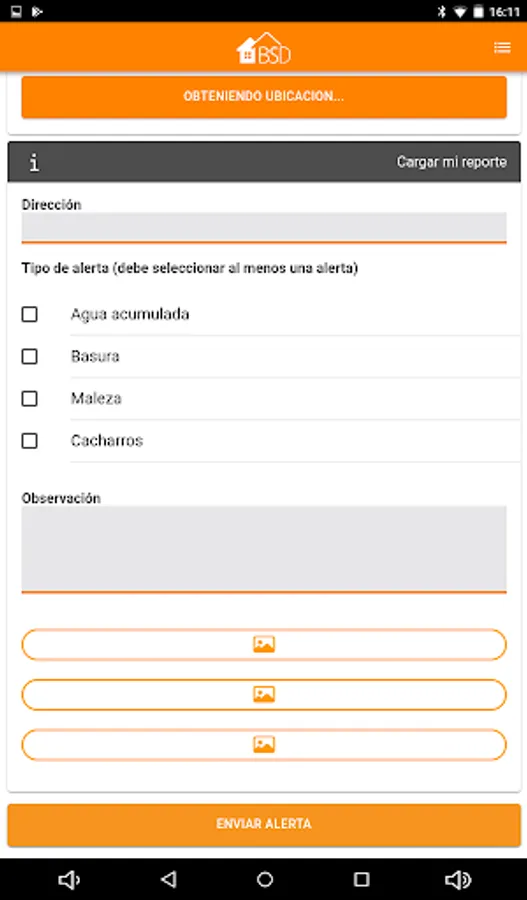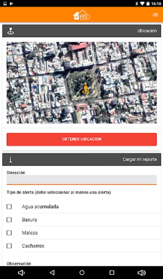 This tool uses the GPS of the mobile device to locate foci accurately on a map and a form where users add the description of the problem and select an alert type, among other options that may include accumulated water, trash, weeds and pots, to finish can add a photo of the geographical area reported.