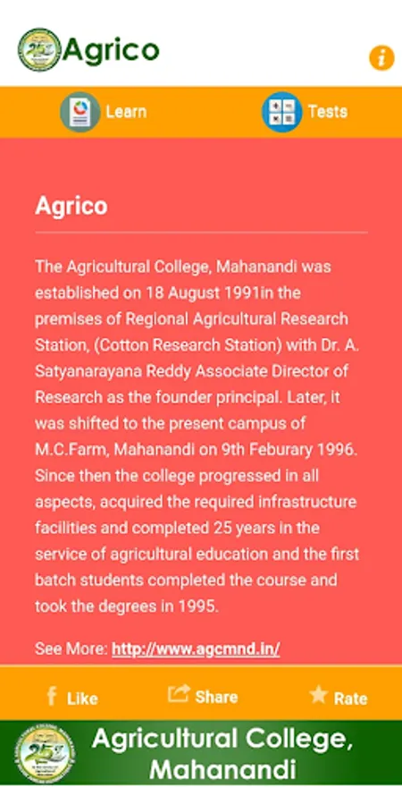 The Agricultural College, Mahanandi was established on 18 August 1991in the premises of Regional Agricultural Research Station, (Cotton Research Station) with Dr. A. Satyanarayana Reddy Associate Director of Research as the founder principal. Later, it was shifted to the present campus of M.C.Farm, Mahanandi on 9th Feburary 1996. Since then the college progressed in all aspects, acquired the required infrastructure facilities and completed 25 years in the service of agricultural education