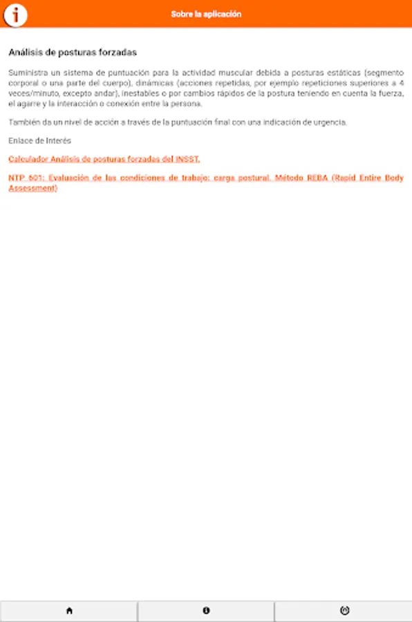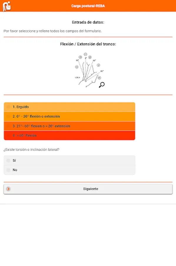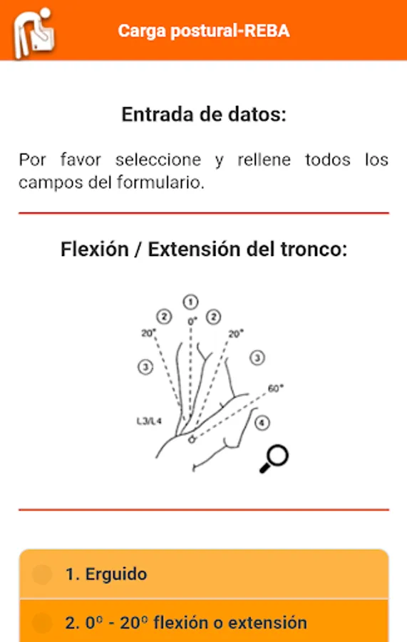 Provides a scoring system for muscle activity due to static posture (body part or a body part), dynamic (repeated actions, for example greater than 4 times / minute repetitions, except walking), unstable or rapid changes in posture considering the strength, grip and the interaction or connection between the person.