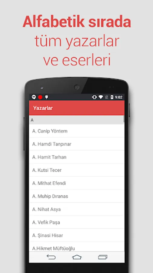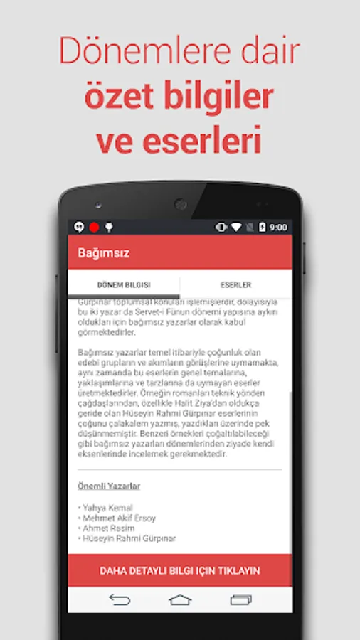 Game modes in addition to the menu "Current List" tab you can view the entire period using the period of summary information, detailed information, you can reach all the writers of the period and all the works of these authors. However, in the menu "Authors List" tab, you can access the application using the alphabetical list of all authors within these writers can view by touching the names of each of the works.