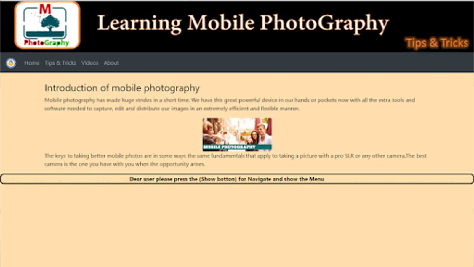 Mobile photography is one of the most hot topic nowadays. The aim of this application is to help users by giving some simple tips and tricks who is interested in mobile photography. This application is created by Honar Omer H.Amen, as a part of Final project of ICTE514 "Interactive Applications in internet based Education" course, Faculty of Education, Eastern Mideterranean University. Course Instructor: Prof.Dr.Yaşar Özden and Year :2016 Spring Semester. Material used for preparation, Visual studio 2015, HTML5 , CSS, Java Script, Photoshop and Power point 2016.