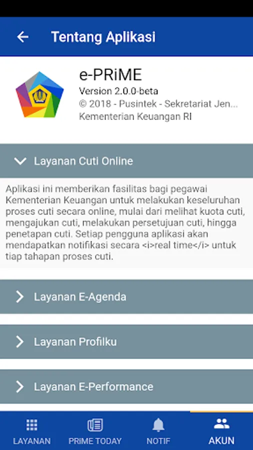 This feature provides facilities for employees of the Ministry of Finance to carry out the whole process off online, ranging from seeing quota of leave, ask leave of absence, do leave approvals, until the determination of the leave. Each app users will get a notification in real time for each stage of the process leave.