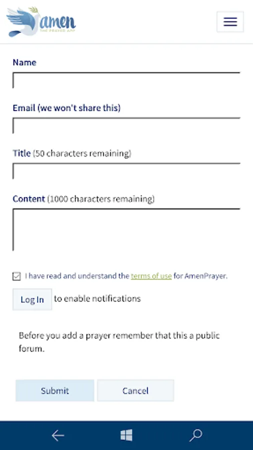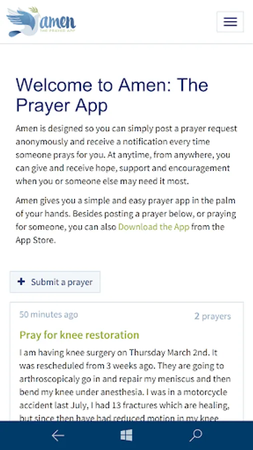 Amen: The Prayer App is an application that allows you to post prayers anonymously and then receive the encouragement of knowing others are lifting you up in prayer. Thousands of people gather each day via the Amen platform to give and receive hope through prayer.