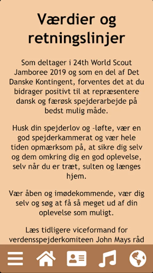 Dette er den officielle lejrbogsapp fra det danske kontingent til verdensjamboree i West Virginia 2019. App'en her, er primært beregnet til selve turen. App'en indeholder blandt andet en omregner så du nemt kan oversætte de amerikanske enheder til de danske. Derudover indeholder app'en også et hav af sange som kan synges på lejren. App'en indeholder selvfølgelig også alt hvad du skal vide i forbindelse med jamboreen og den danske deltagelse.