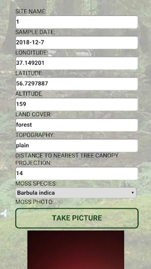 A mobile application that allows filling in required by the UNECE ICP Vegetation manual information about sampling sites. The application automatically sets longitude and latitude of the sampling site, controls correctness of the input data and allows capturing photos of the moss samples. Application integrated with the DMS (moss.jinr.ru) and all information about sampling sites can be imported to the DMS.