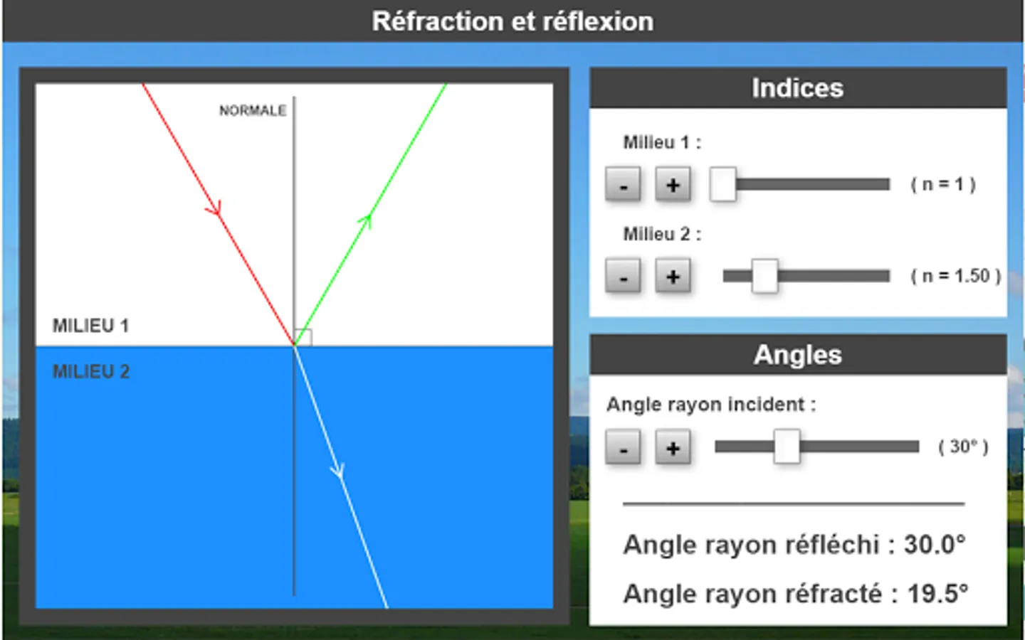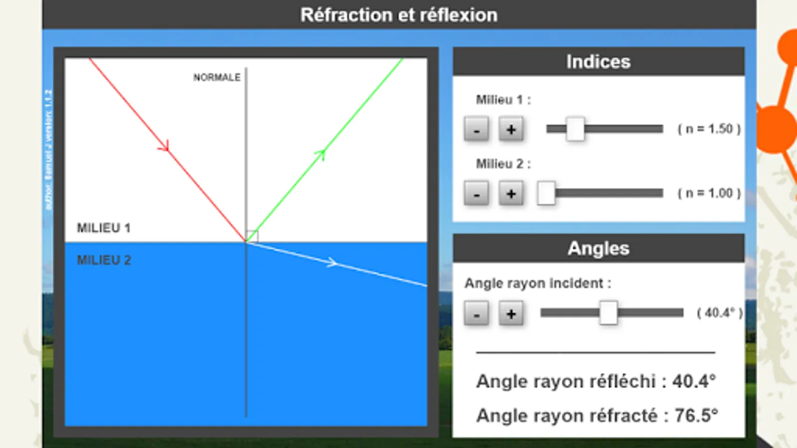 The "Refraction and reflection" animation allows to study the phenomenon of refraction and reflection. The animation also makes it possible to determine the limit angle of refraction in a fairly precise way. It is possible to change the index of the two middle and the radius of the angle of incidence.