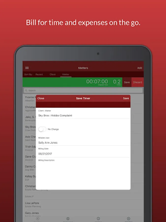 - Use timers and convenient billing functionality to make sure you never lose billable time associated with work you do between meetings, on the way to the office, or on the spur of the moment.