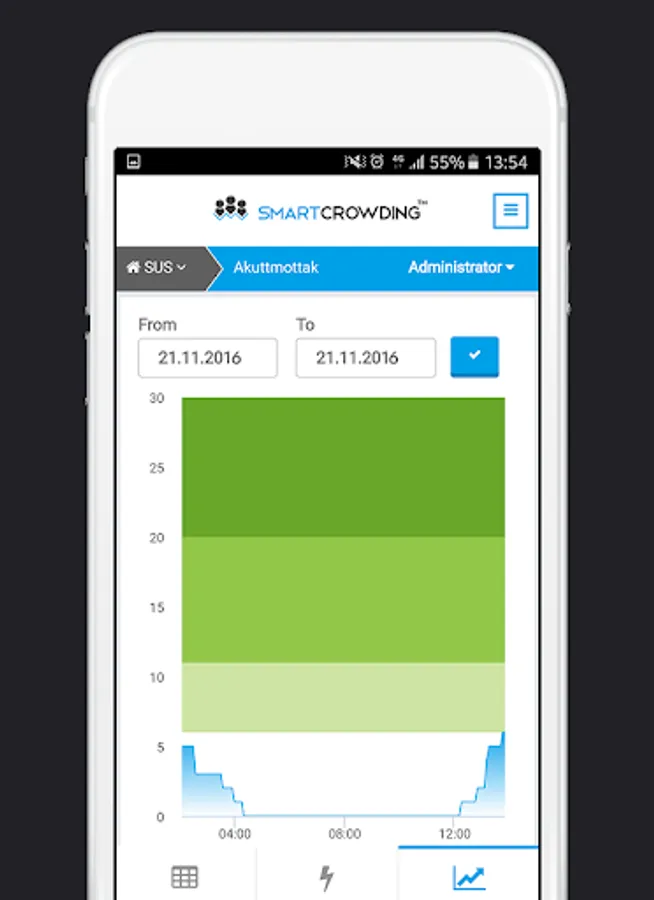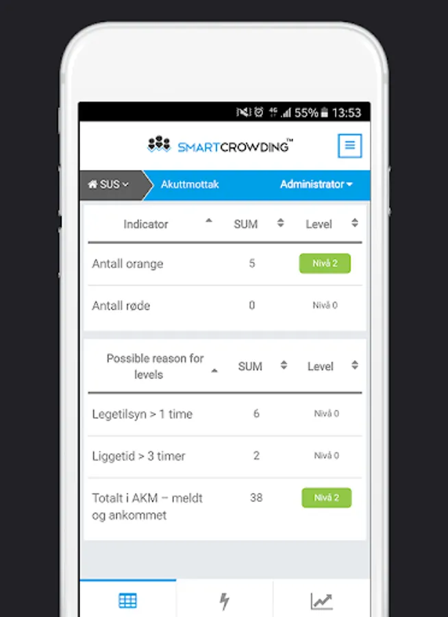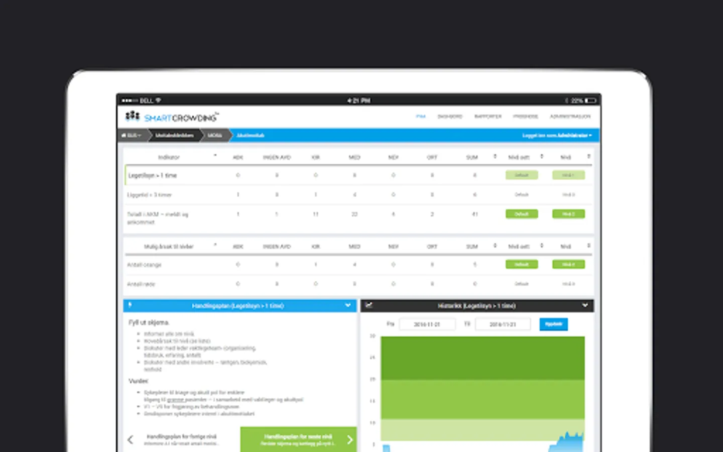 SmartCrowding is an easy and user friendly decision support app. The solution helps mainly hospital staff to plan for high activity occurrences in order to reduce stress and waiting time through effective visualization and communication. The methods behind which the system is built are developed and tested by a large Norwegian health network since 2013. This R&D based problem solving tool has served to manage patient flow in an emergency department together and a health care organization as a whole. SmartCrowding is easily accessible for everyone both on mobile and web platforms, giving the possibility to have it on a big screen within a department. In addition, one would have a graphical overview of a department status and management plans. All the data required to define activity levels and management plans are easily configured by a hospital interface through a few easy steps to follow. The solution supports the most important operational confidence values, quality, effectiveness and responsiveness.