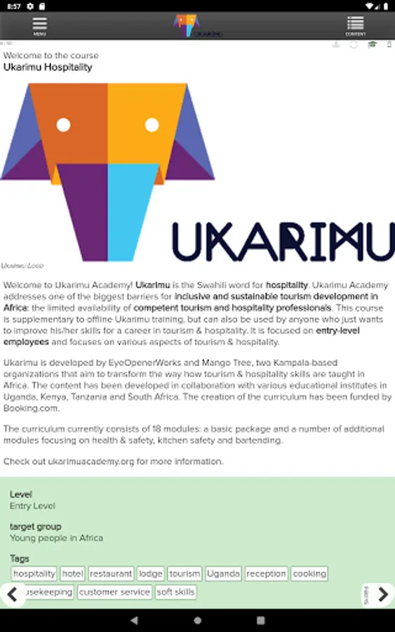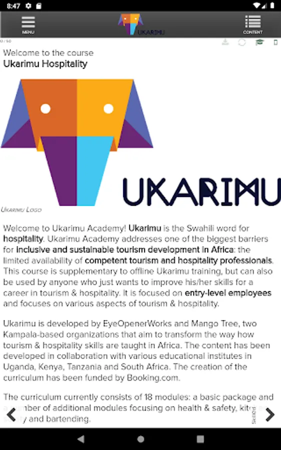 Ukarimu is developed by EyeOpenerWorks and Mango Tree, two Kampala-based organizations that aim to transform the way how tourism & hospitality skills are taught in Africa. The content has been developed in collaboration with various educational institutes in Uganda, Kenya, Tanzania and South Africa. The creation of the curriculum has been funded by Booking.com.