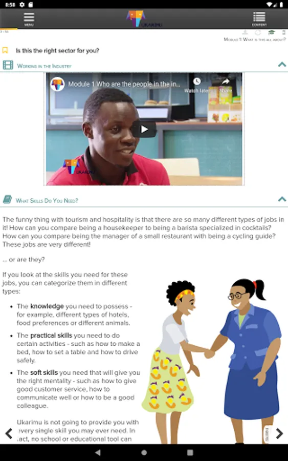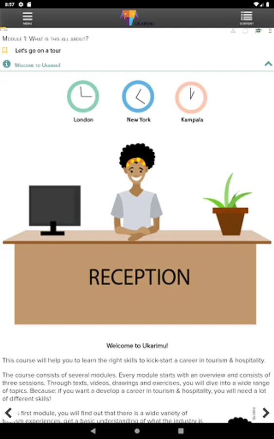 This app contains a course on tourism & hospitality which, except for the videos, can be accessed offline. This course is supplementary to the class-based trainings of Ukarimu Academy, but can also be used by anyone who just wants to improve his/her skills. It is focused on entry-level employees and focuses on various aspects of tourism & hospitality.