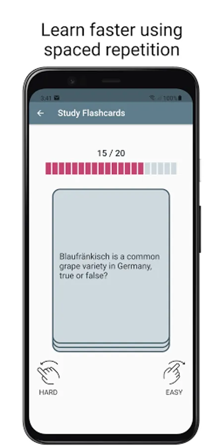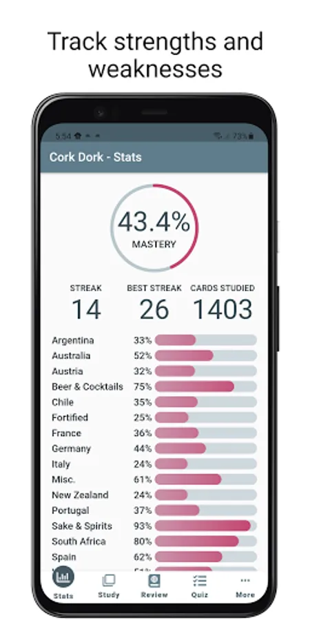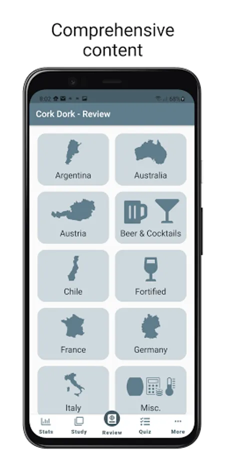 Cork Dork Wine Study uses proven techniques from cognitive science which adapt to your memory and wine knowledge. Spaced repetition and interval-based active recall helps you maximize wine knowledge retention. Difficult flashcards appear more often, easy flashcards appear less often. You remember more with less effort. Wine study has never been easier!