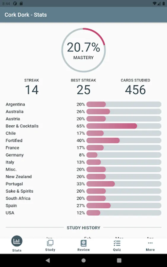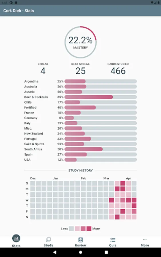Daily reminders and a streak heatmap keeps you motivated and helps you form good wine study habits one day at a time. Don't break the chain otherwise your wine study streak will reset to zero!