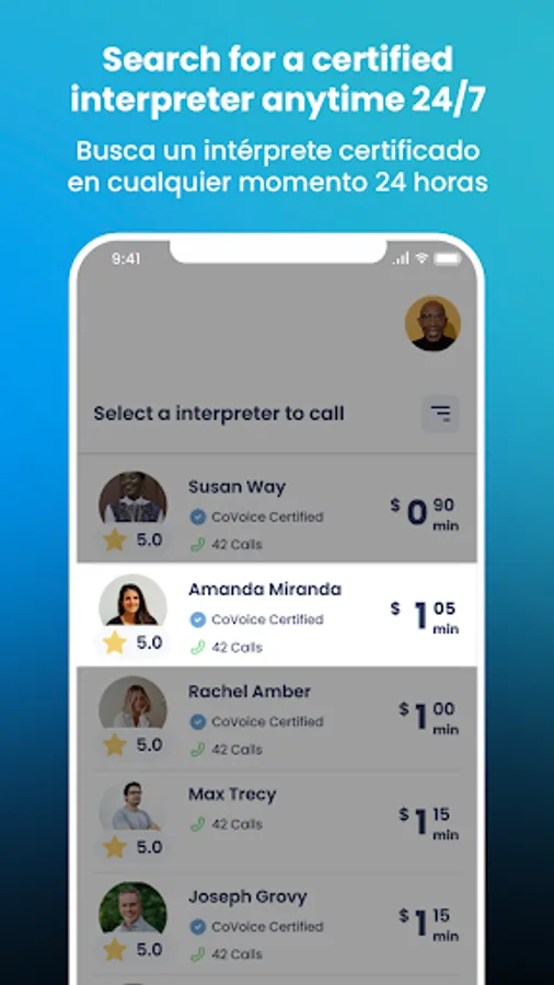 La aplicación CoVoice lo conecta con intérpretes de idiomas calificados a través de una llamada telefónica de video o audio en solo segundos. Es como tener su propio intérprete personal donde quiera que esté y cuando lo necesite.