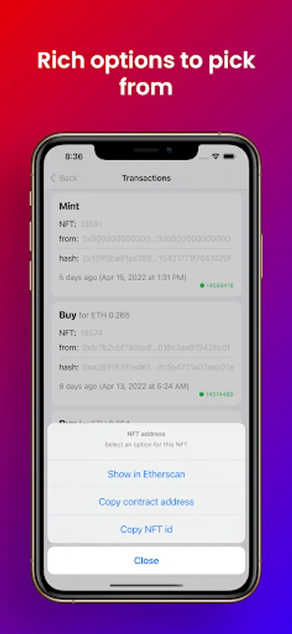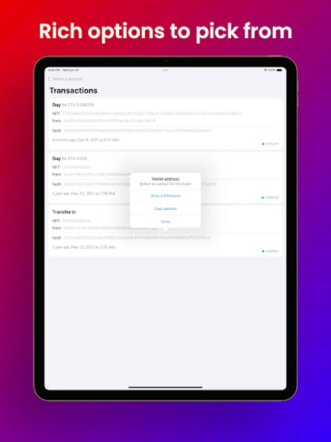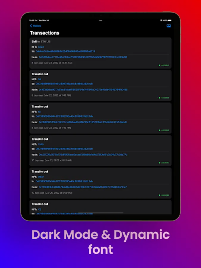 - Tapping on one NFT, tx or other addresses will redirect you to Etherscan/Polygonscan;