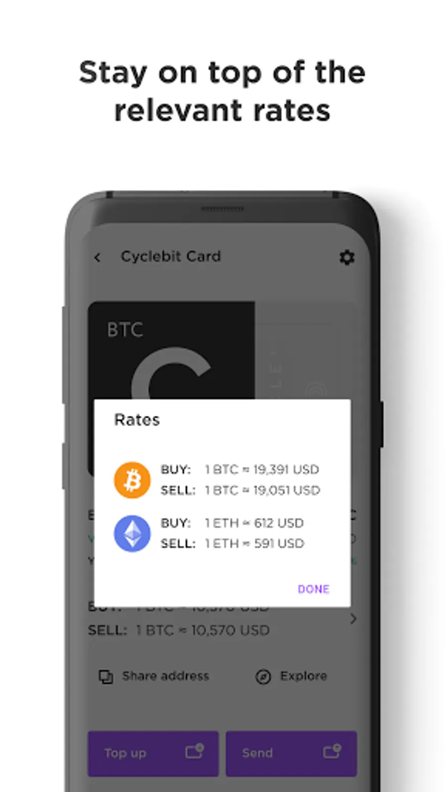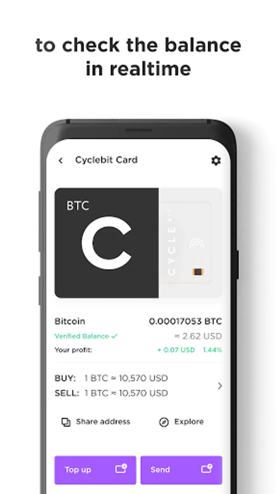 Cycle Wallet links you to your Cycle Card, enabling you to buy cryptocurrency directly from the Cyclebit, check your balance and manage your funds in one single place, all with top-tier security standards encased in your card's revolutionary cryptographic microchip.