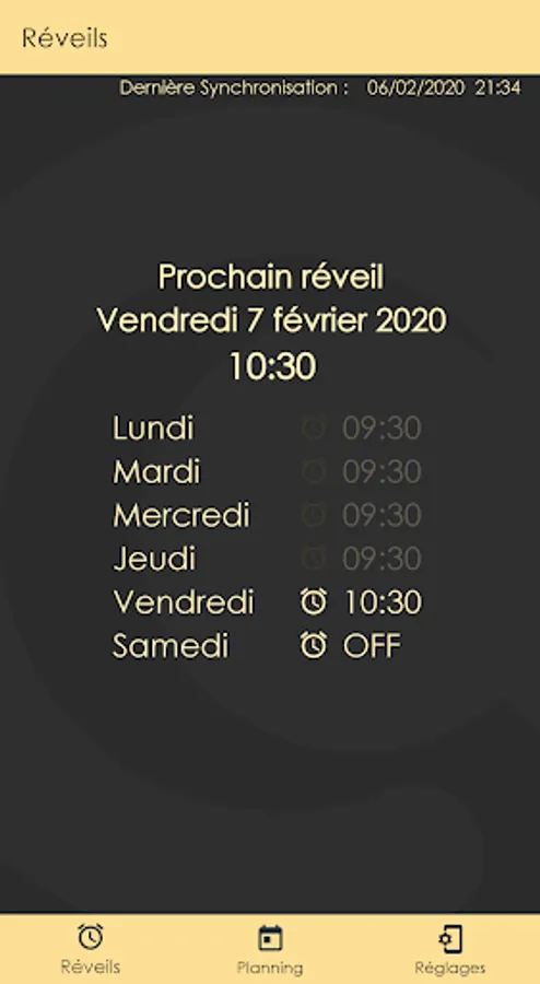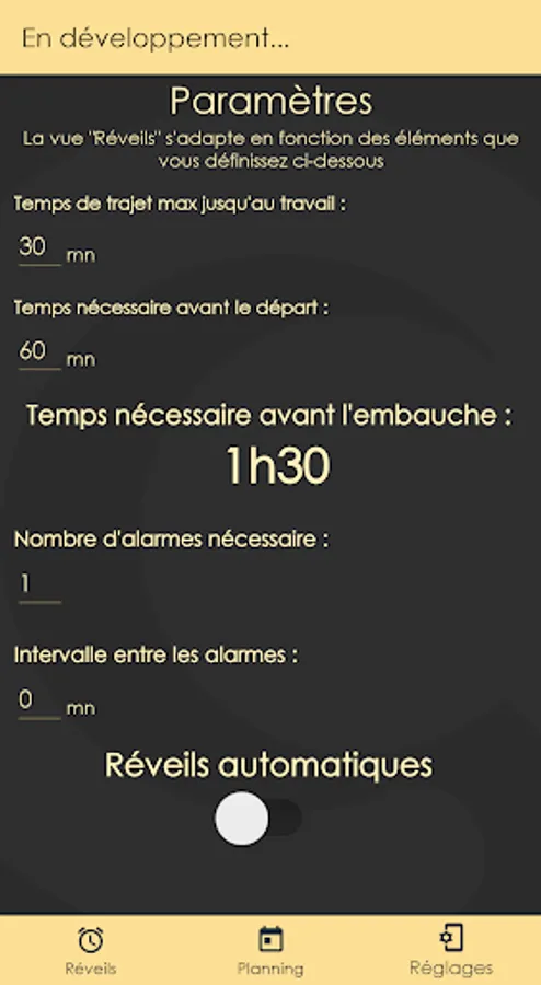 The final goal is that it can manage alarm clocks automatically according to a preparation time and a given travel time, defined in a "parameters" view.