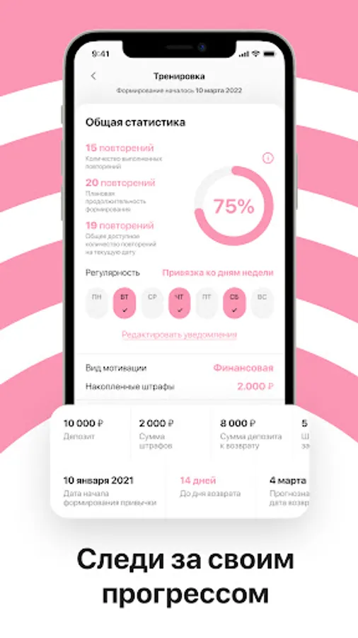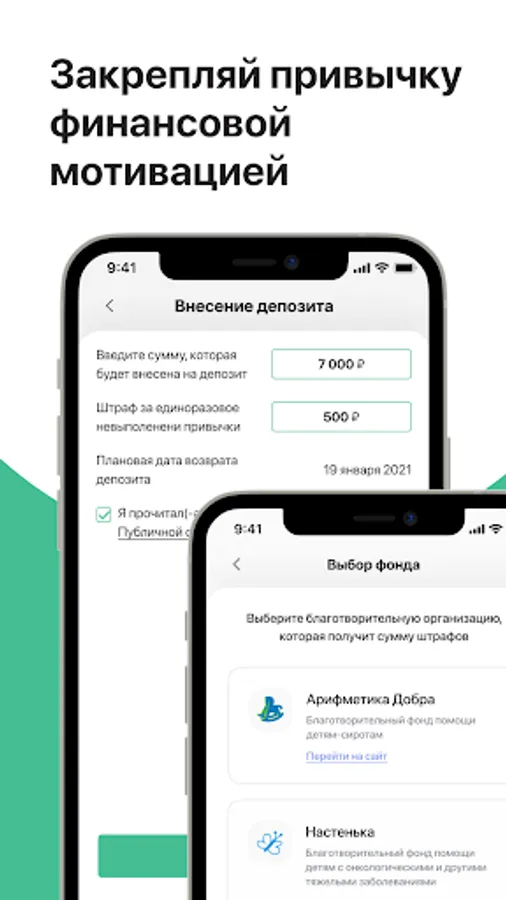 ✔ Financial motivation. You place funds on deposit and choose a charitable foundation to which your "penalties" will be sent in case you do not complete the planned actions. In this way, you can develop yourself, feel additional responsibility, be honest with yourself and know that your honesty helps those who need our help.