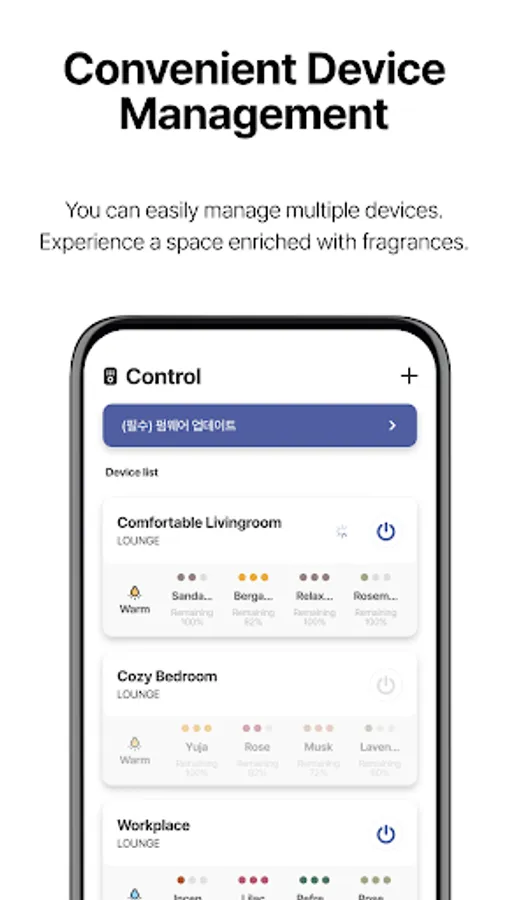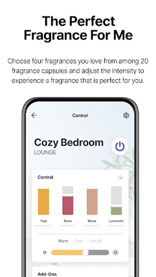You can adjust the intensity of each scent capsule among the four. You can control the device regardless of your location and adjust the tone and intensity of the lighting according to the ambiance. We recommend scent recipes that can be created using the four different scent capsules, and you can easily enjoy these recipes with a simple press of a button.