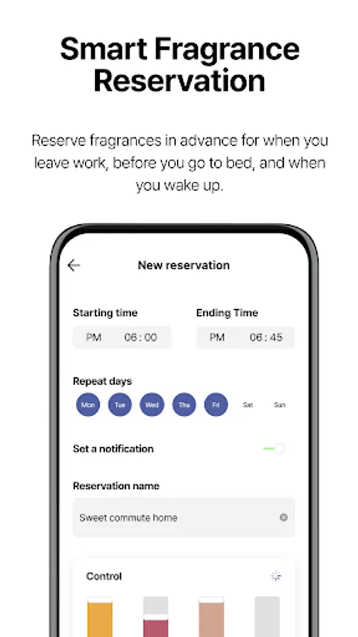 With the scent reservation feature, you can set your preferred recipes to be diffused at your desired time, allowing for efficient use of the scent capsules. You can set the start and end times of the diffusion, as well as repeat days, for a convenient scent experience.