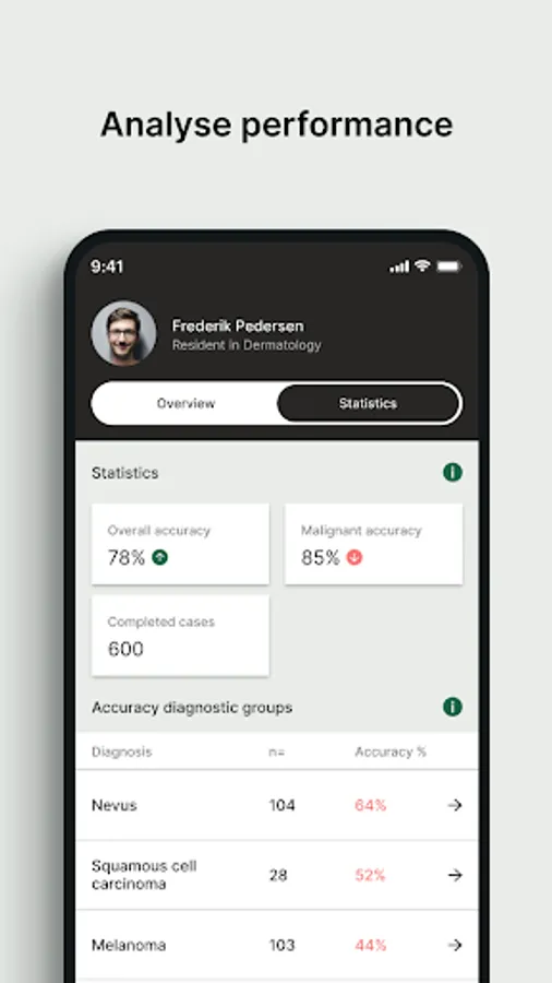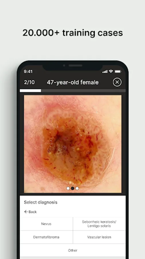 The app offers extensive case-based practice on 20.000+ training lesions belonging to the following diagnostic categories: melanomas, nevi, seborrheic keratoses/solar lentigo, vascular lesions, basal cell carcinomas, squamous cell carcinomas, actinic keratoses and dermatofibromas.