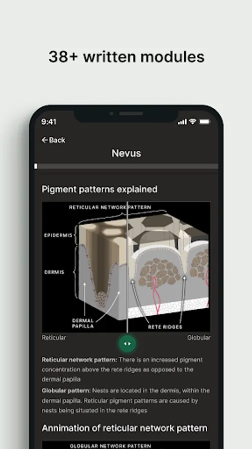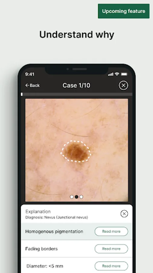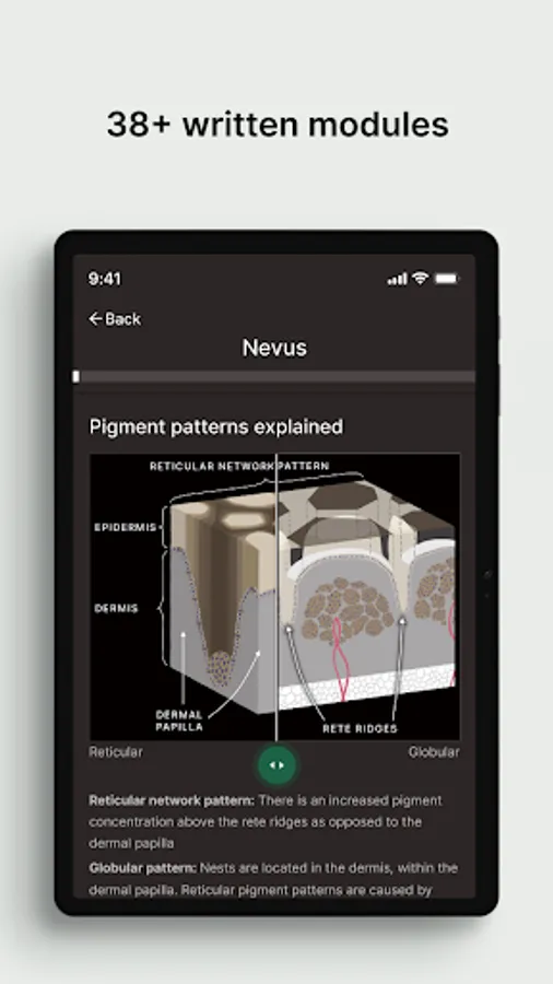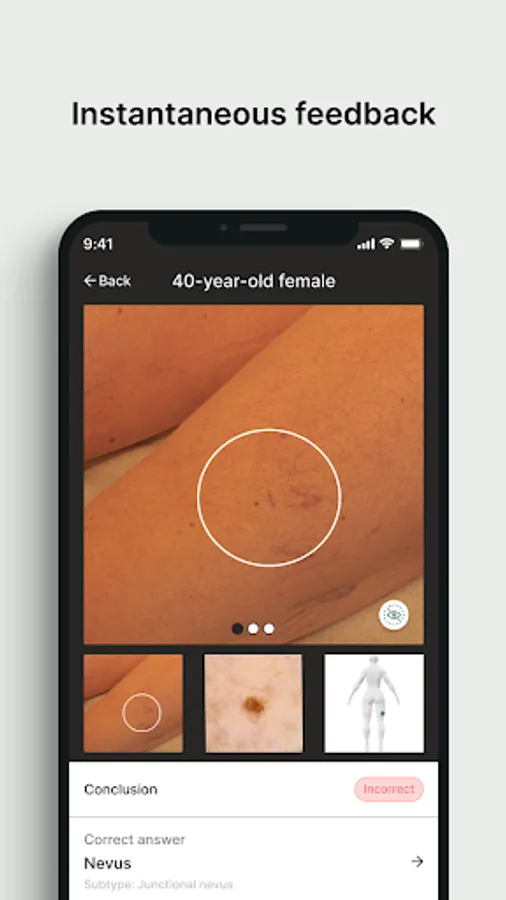 Each case-diagnosis is rewarded with instantaneous feedback, including feature annotation and access to 38+ diagnosis modules with in-depth descriptions of the underlying pathology, clinical presentation and dermoscopic criteria that signify each diagnosis.
