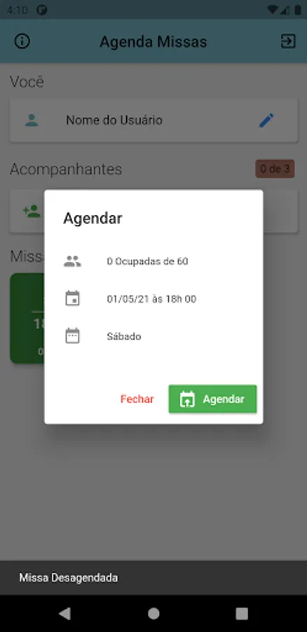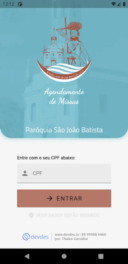 "Agenda Missas" is an application in order to facilitate the scheduling of masses in the parish of Paróquia São João Batista in Oliveira - MG, it was developed to be easy and intuitive, so that anyone with a simple cell phone can use it, needing only your CPF to enter the application.