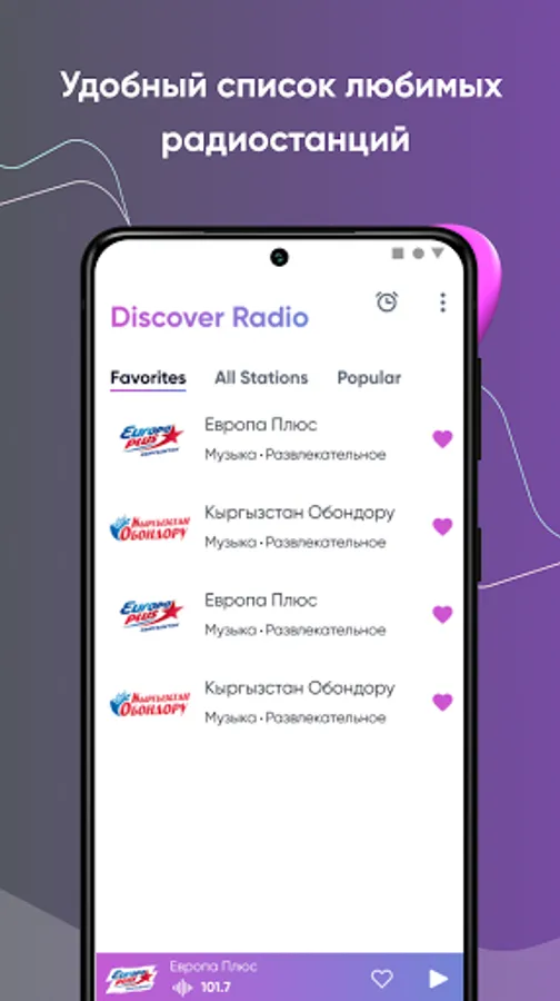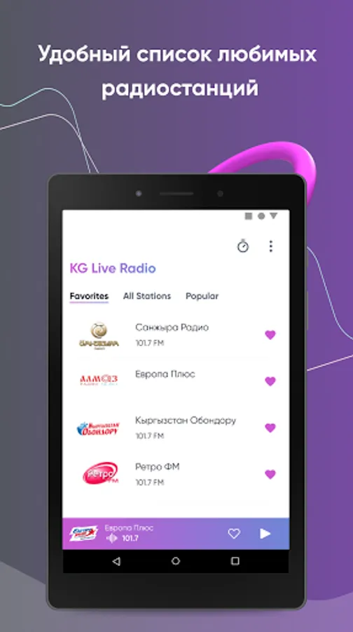 KG Live Radio is a mobile application for listening to radio stations. The general catalog contains the best radio stations of Kyrgyzstan and neighboring countries. You can definitely find your favorite radio among this list.