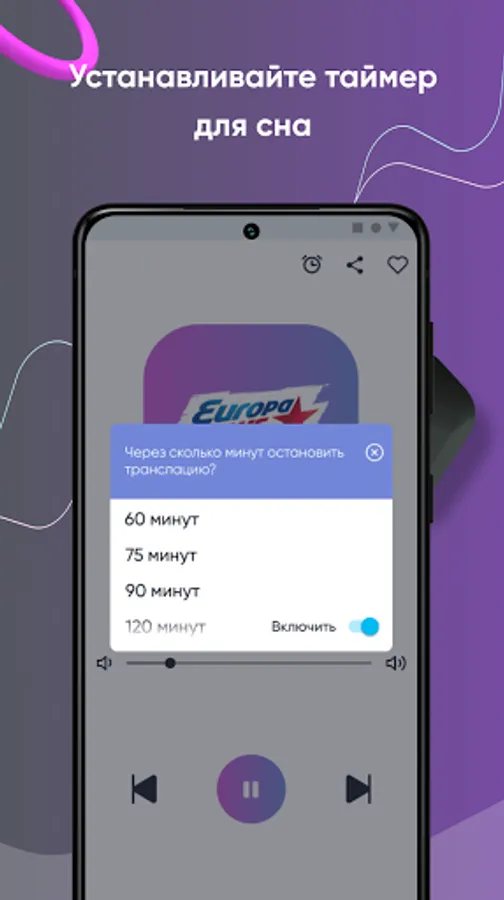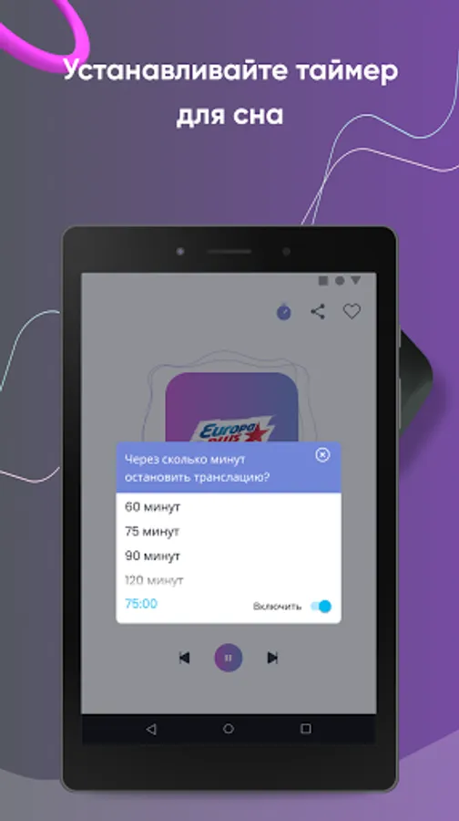 • Sleep timer. Click on the timer icon, set the time before shutdown and KG Live Radio will shut down automatically.