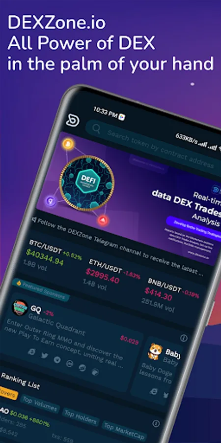 Keeping you updated about recently launched BSC tokens is the primary intent of this cryptocurrency tracker app. After creating your account on DEXZone, you will be able to search for the desired token by having a contract address. Addition of a group with many features for people who want to introduce or discuss the selected token.