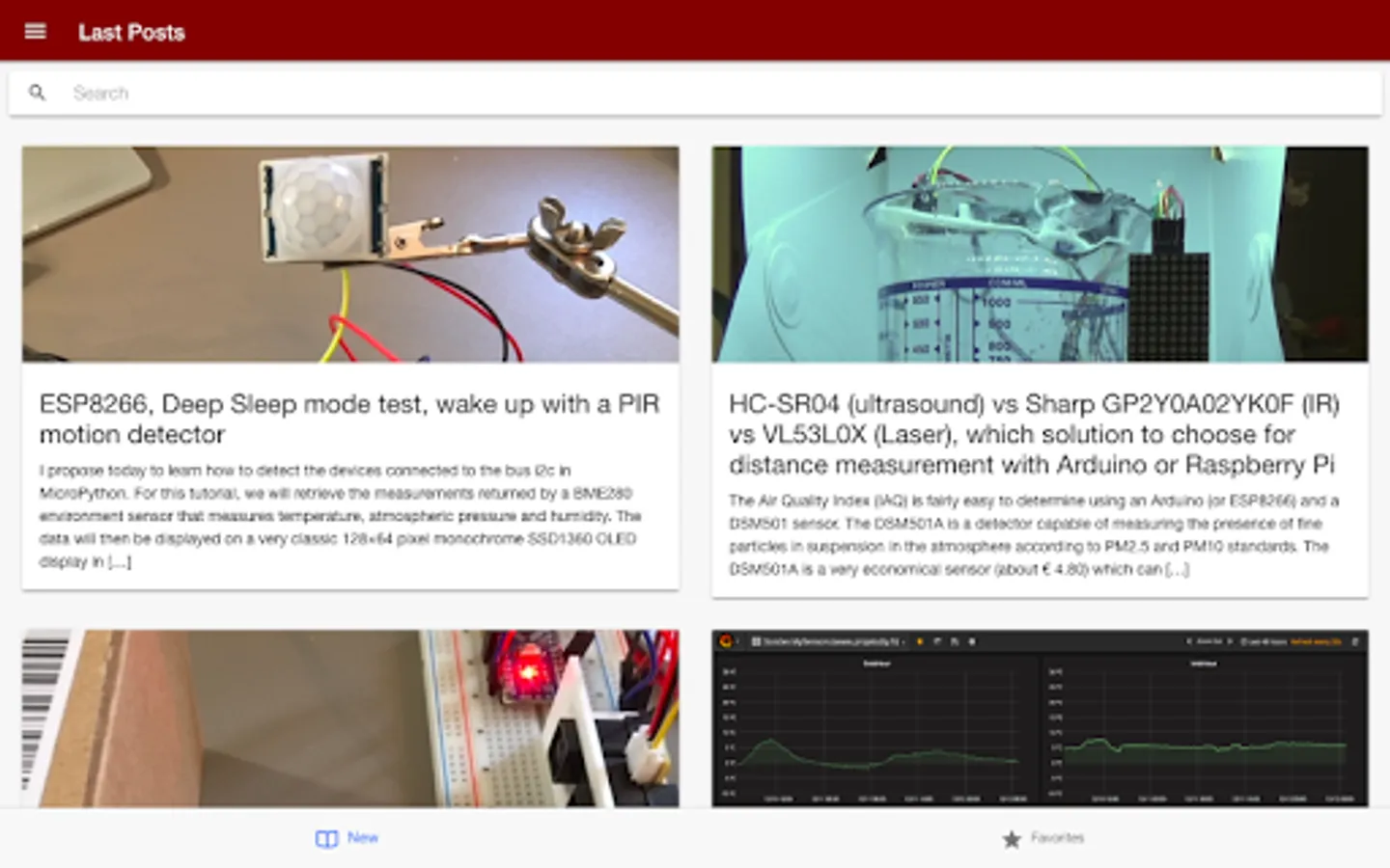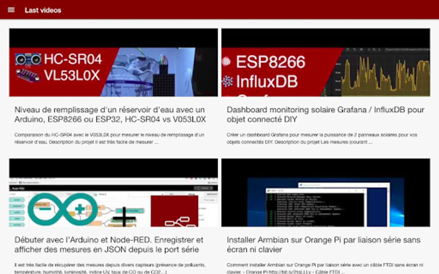 More than 60 categories of articles are available to easily search for a tutorial, a test or a project. News of mini PCs (Raspberry Pi, Orange Pi), micro-controllers and development boards based on ATmega (Arduino), ESP32, ESP8266, framework for the development of DIY connected objects (Blynk, Cayenne, MySensors, ESP Easy , Johnny-five), Arduino / ESP32 and ESP8266 microcontrollers programming (client / server programming, NTP time server, SPIFFS memory, HTML / CSS Web interfaces with Bootstrap ...), home automation equipment (Xiaomi Aqara and Mijia, Sonoff), installation and configuration of a DIY home automation box (Node-RED, Domotic, Jeedom, Home Assistant, Homebridge ...), dashboard and data storage (influxDB, MongoDB), home automation protocols (MQTT, HTTP, Websocket ...), development environment for IOT projects (NodeJS, MicroPython Arduino IDE, PlatformIO), retro gaming, linux and Raspbian tutorials