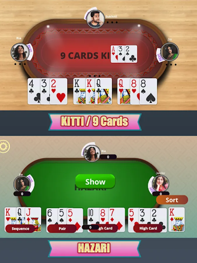 Hazari is Kochila varient where the objective of the game is to score 1000 points. The player that gets 1000 points first wins this card game. Hazari easy to play and is also a variant of 9 cards (kitti).