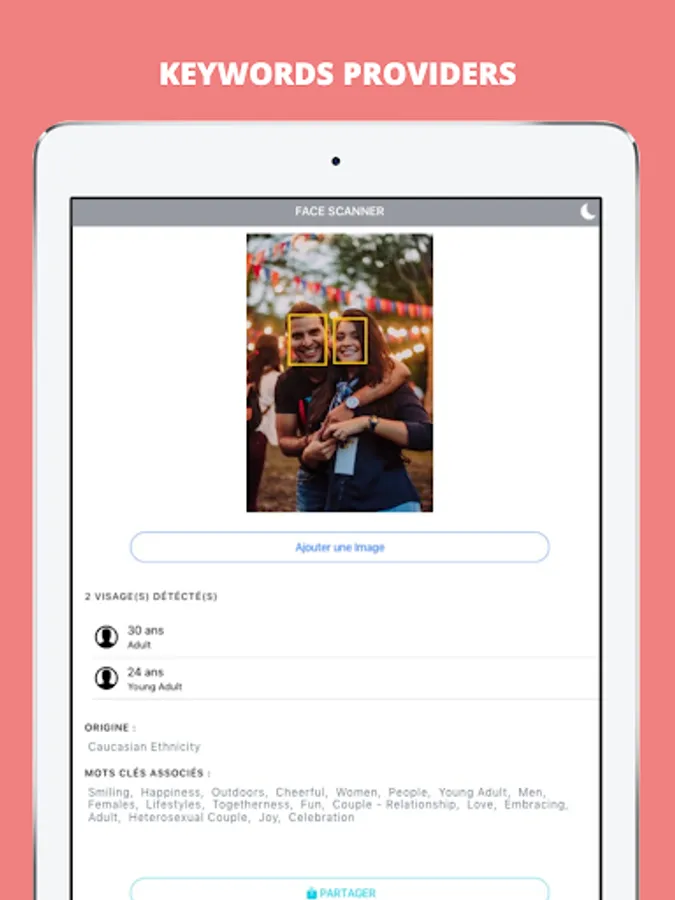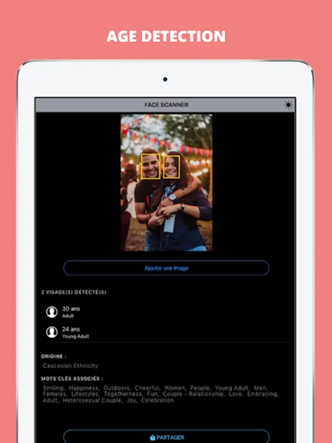 5. After scanning You’ll find the guessed age with characteristics like young, adult, celebration, cheerful, couple, man, woman, happiness etc.