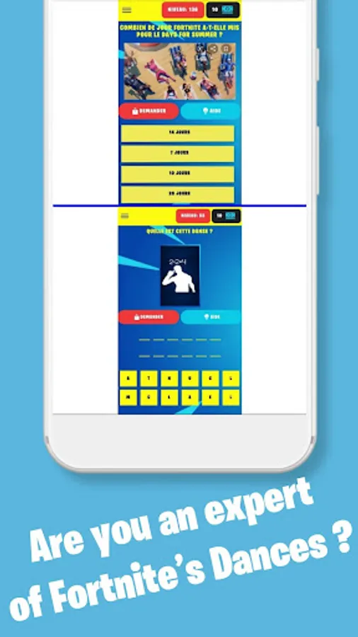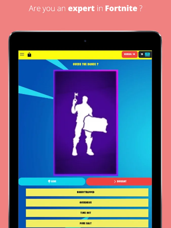 With this app, you can test how much an expert you are in Fortnite by guessing our quizzes about all the famous Battle Royale dance moves & emotes. Besides that, we also have quizzes about the cosmetics, the weapons, and the skins in the game for you to guess so that you can test your knowledge about the game or to expand it.