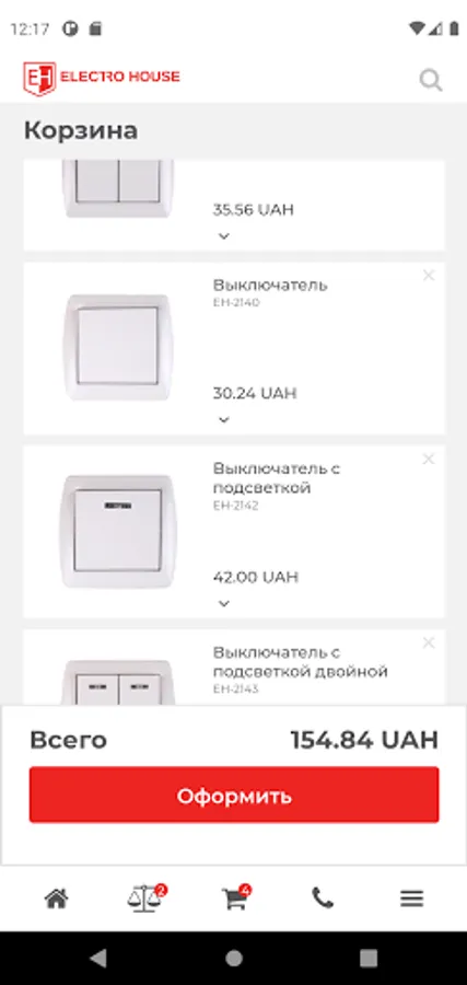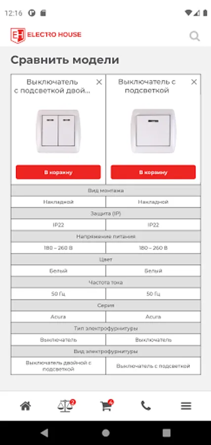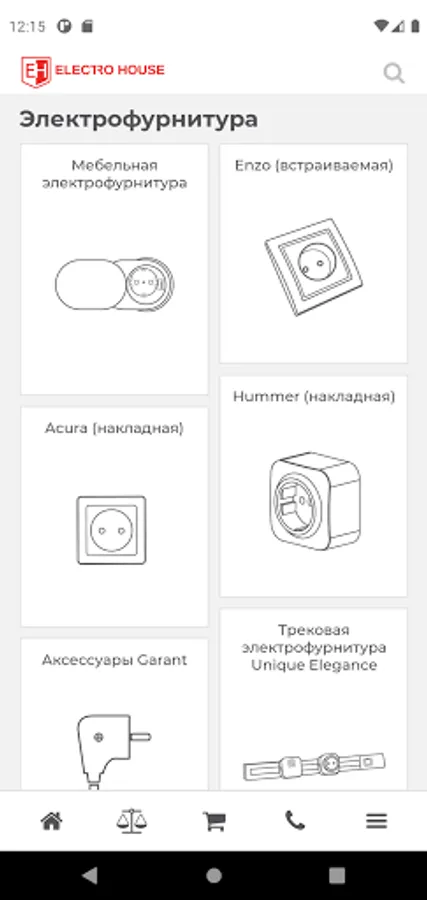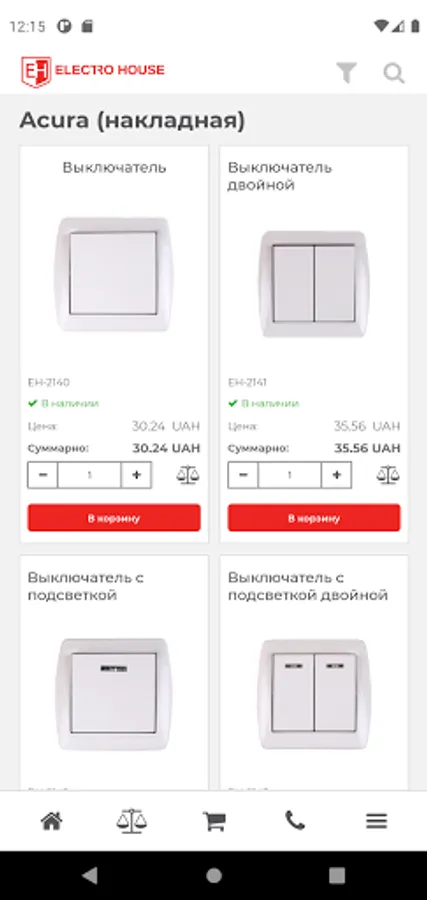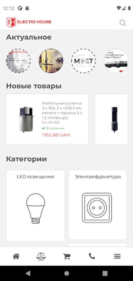For your convenience, the products in the application are divided into categories and subcategories. For example, if you open the LED lighting category, you will see subcategories there: LED table lamps, LED panels, LED badges, LED searchlights, T8 LED linear lamps, LED street lamps and so on. When you open the Installation materials category, you will find there subcategories of Cable ties, Electrical tape, Zero bus, Connecting bus, DIN rail, Mounting pad and other subcategories of materials for installation. And if you open the Low-current cable category, then of course, there will be the whole range of FTP and UTP cables, TV cable and Acoustic wire. In the category of Low-voltage equipment, respectively, are RCDs, Contactors and other low-voltage equipment. And having opened the category Electrical accessories, you will see all its diversity - extension cords, furniture electrical accessories, floor electrical accessories, power connectors and much more.