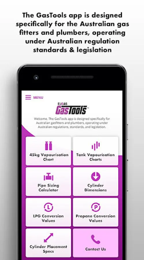 GasTools™ is an app designed specifically for Australian gas fitters. It provides information on vaporisation, pipe sizing, exclusion zones, LPG conversion factors and more.
