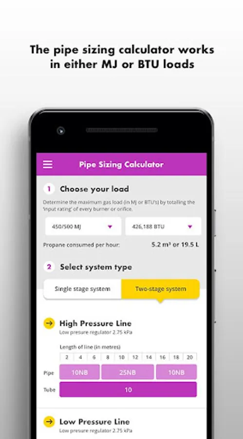 • Pipe sizing calculator works in either MJ or BTU loads. It provides data for both single stage and two stage systems.
