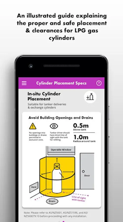 • An illustrated guide explaining the proper and safe placement & clearances for LPG gas cylinders including distances from ignition sources, wall openings and below ground spaces, such as drains or pits.