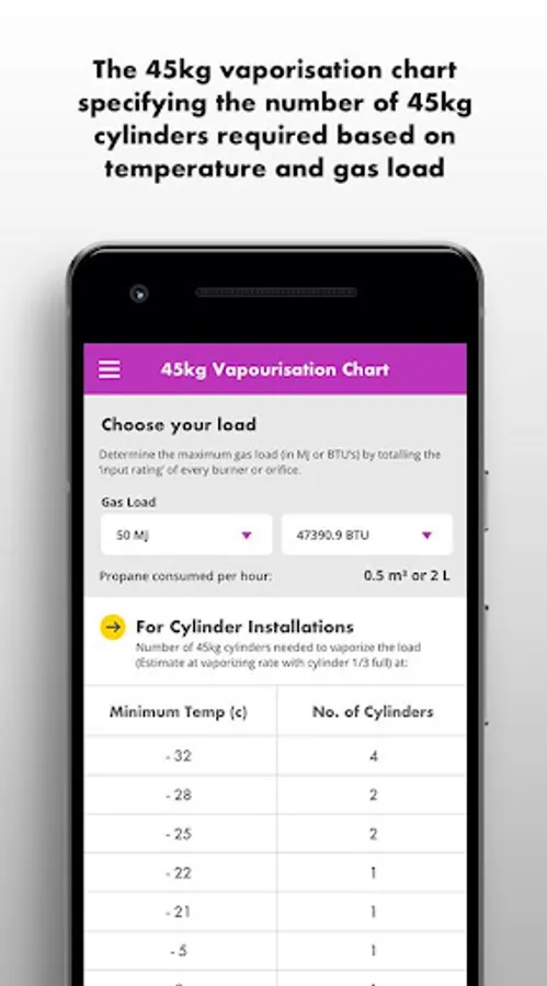 • The 45kg vaporisation chart specifies the number of 45kg cylinders required based on temperature and gas load, in either MJ or BTU.
