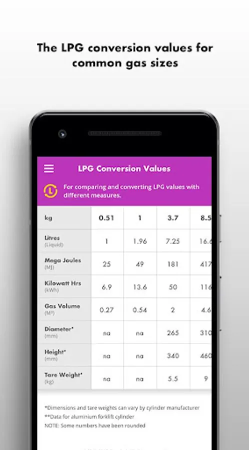 • The LPG conversion values include: kg, litres, megajoules (MJ), kWh & cubic meters (m³) for common gas bottle sizes.