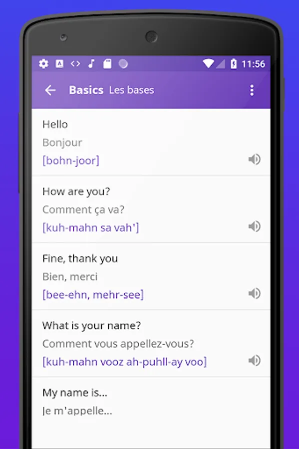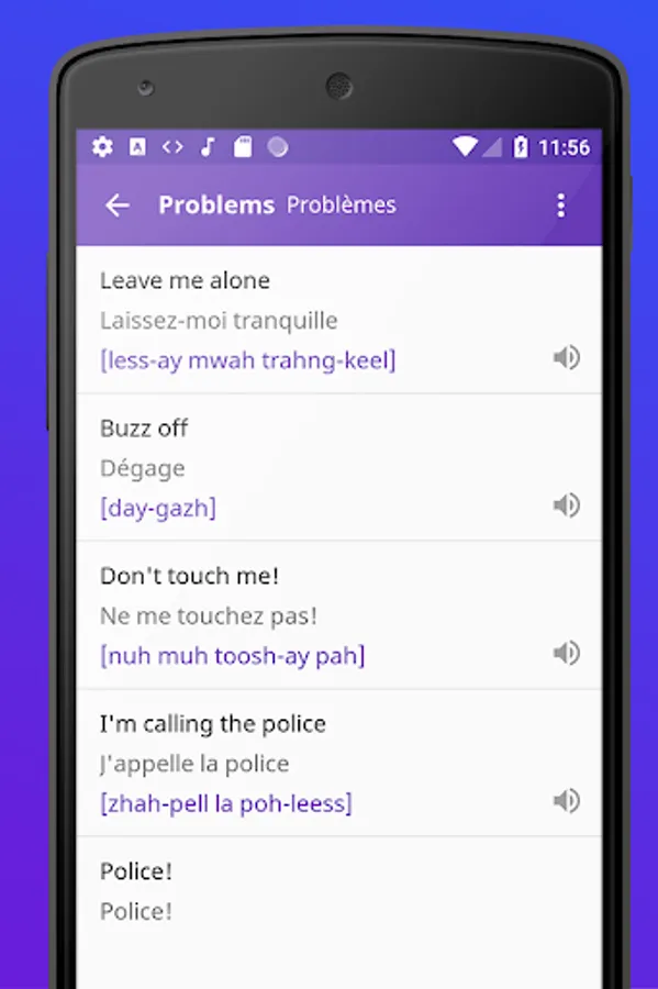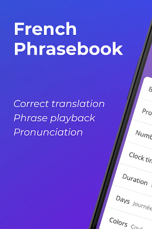 The French Phrases Offline app works without the Internet. Each phrase can be reproduced in English offline.