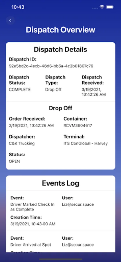 Within our Transportation Management System (TMS), drivers have the ability to view their dispatch details when checking into a terminal. Our app allows them to notify the terminal of their arrival, and navigate to the container until personnel at the yard can assist them on site.