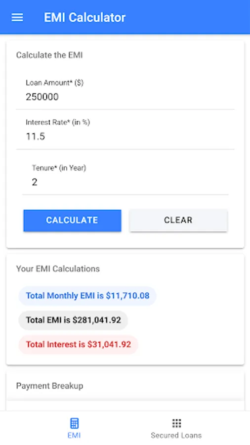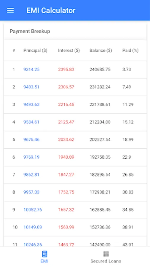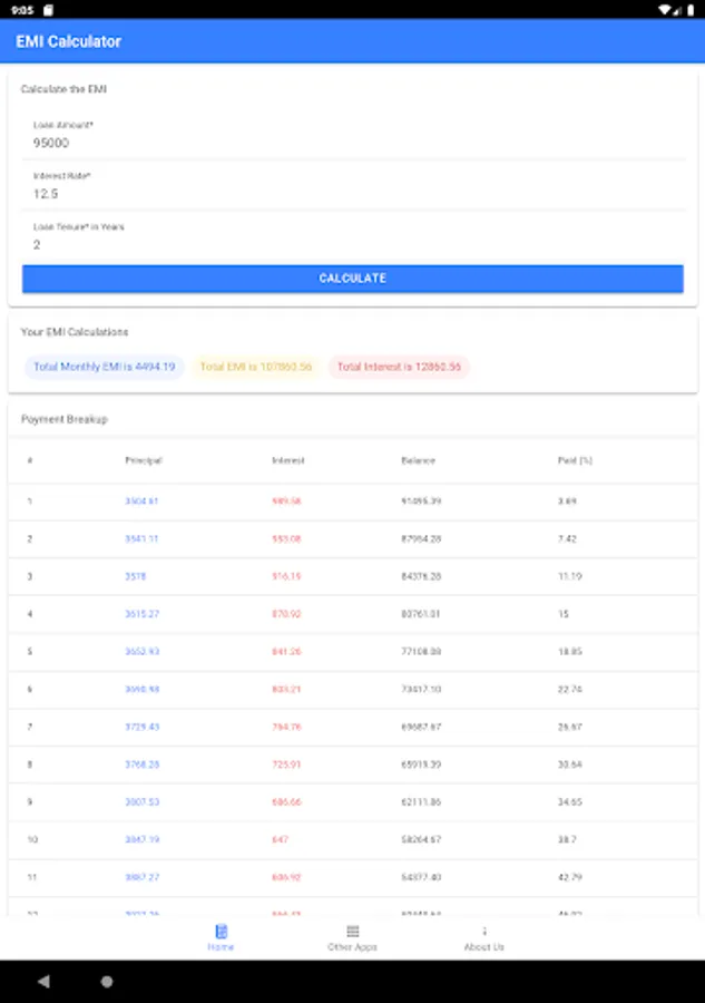 The application not only displays the EMI amount, it will also display information such monthly interest paid, monthly principal paid and monthly percentage paid. It will also display payment schedule during the tenture in the tabular representation.